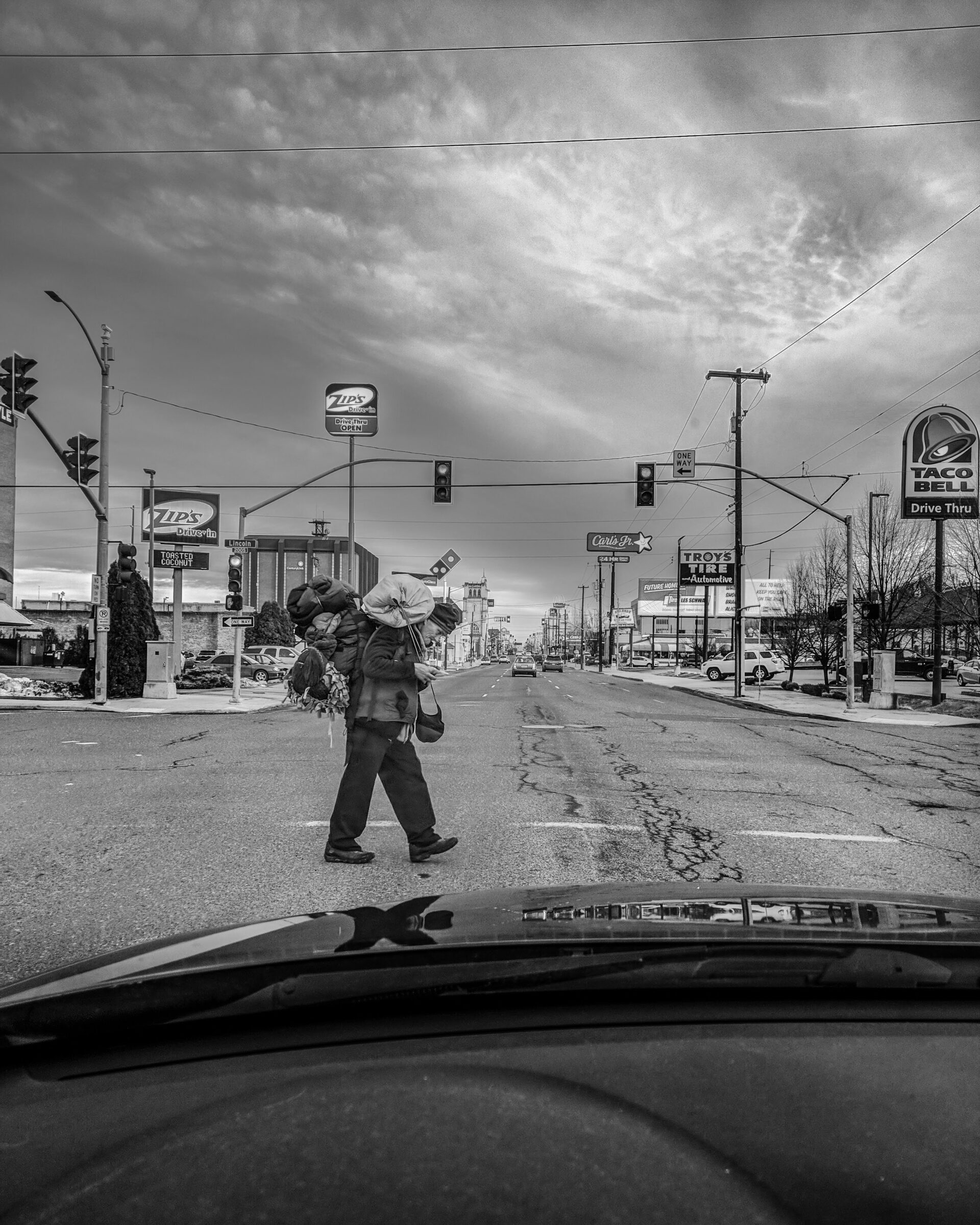 Sometimes I cannot look away and I cannot resist taking up my camera to make a photograph. On a January day in 2020 this man crossed in front of my car. I saw a Sisyphus character laboring under the weight of all his possessions.