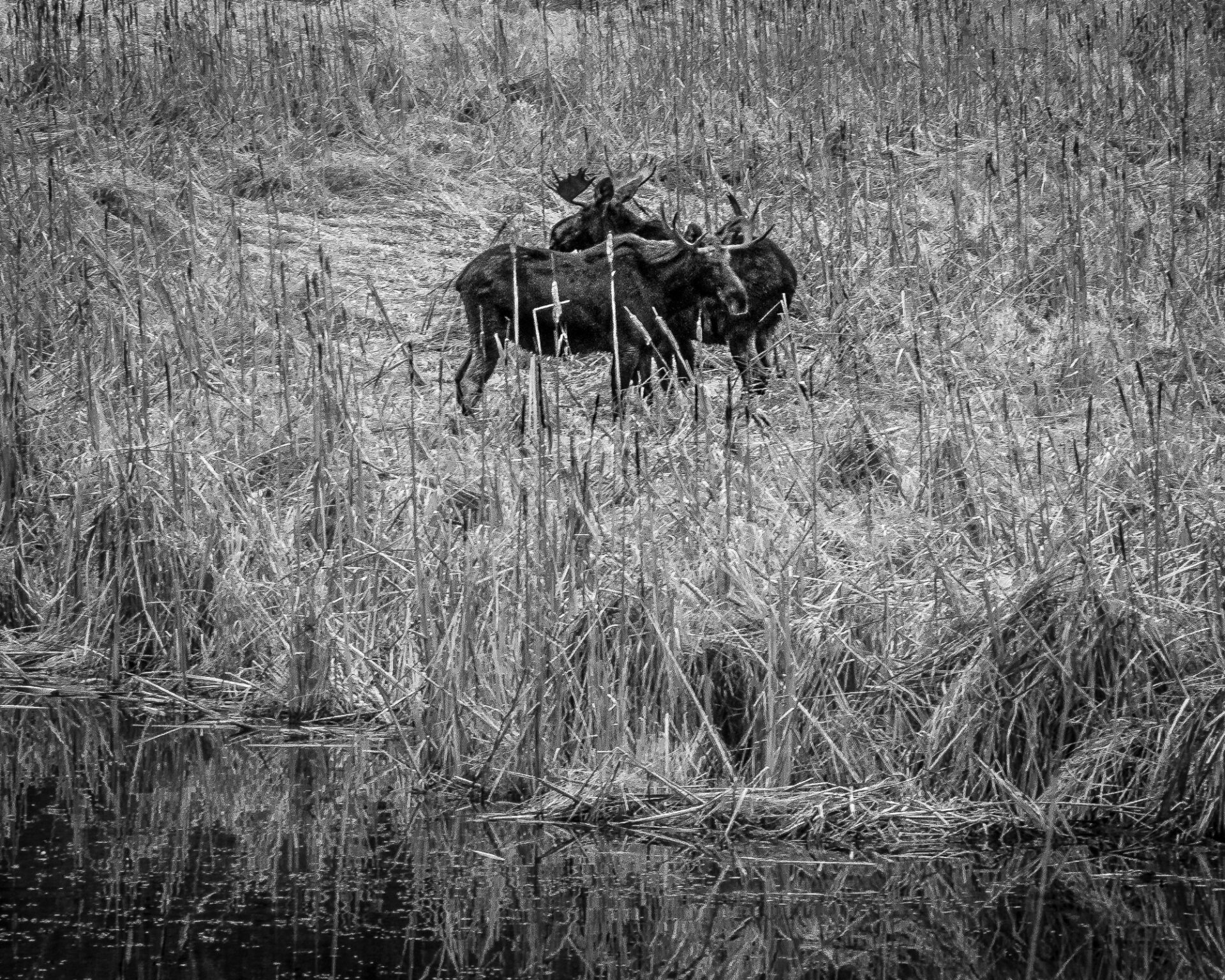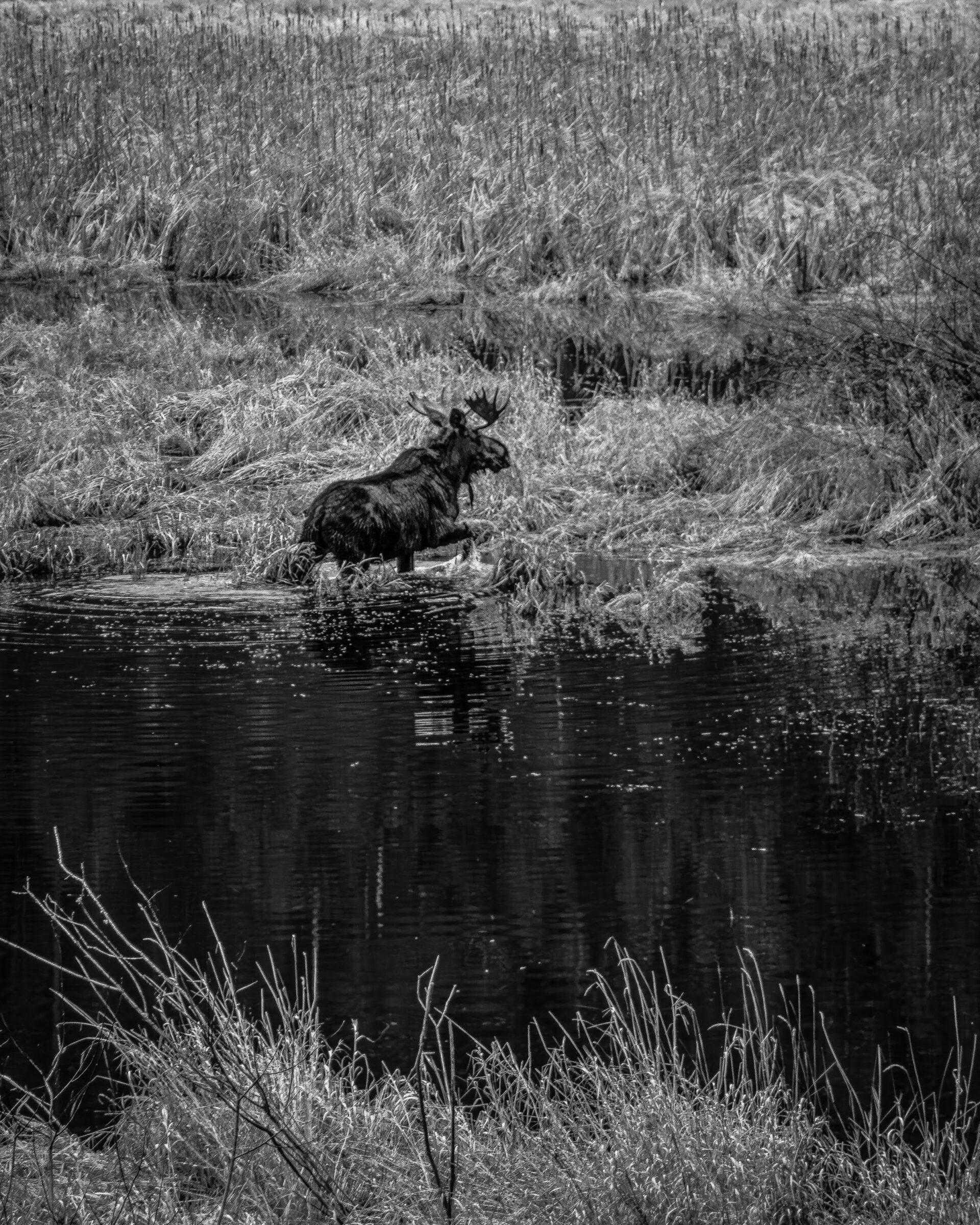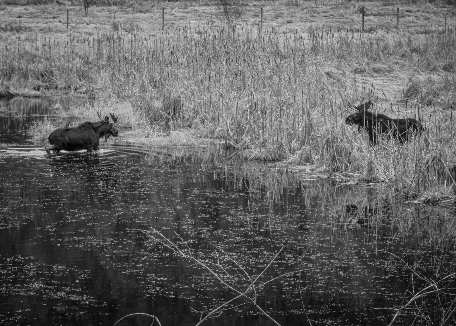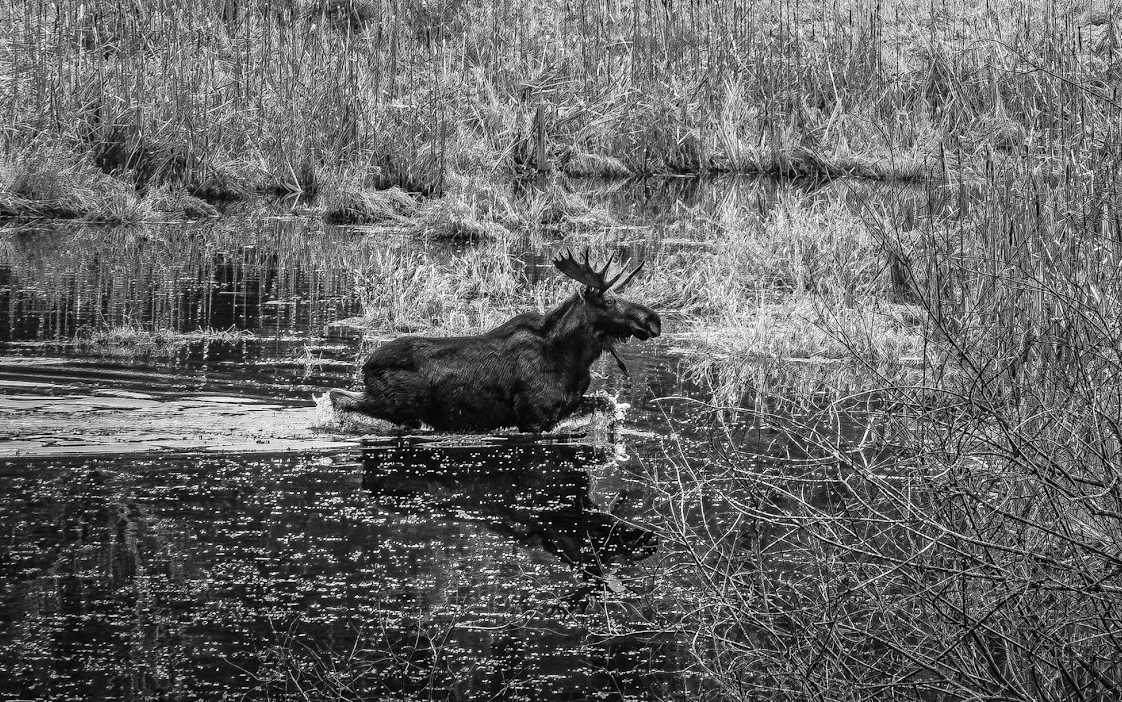 I see moose in my back yard fairly frequently but I have rarely seen them in the water in habitat that looks perfect for them. I could hear the splash of water as they walked across the pond and I could hear the drops from their chin when their large heads emerge from the water.