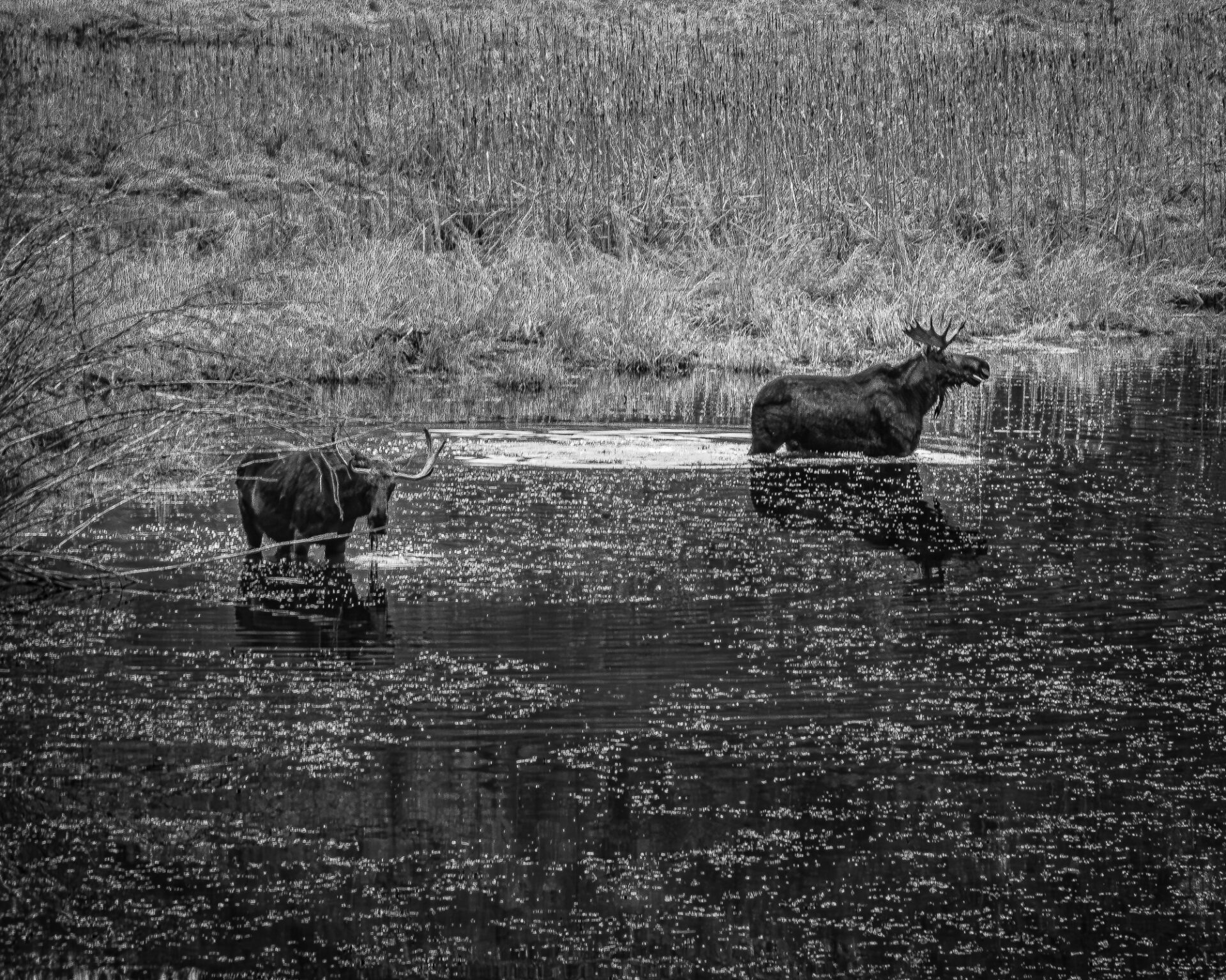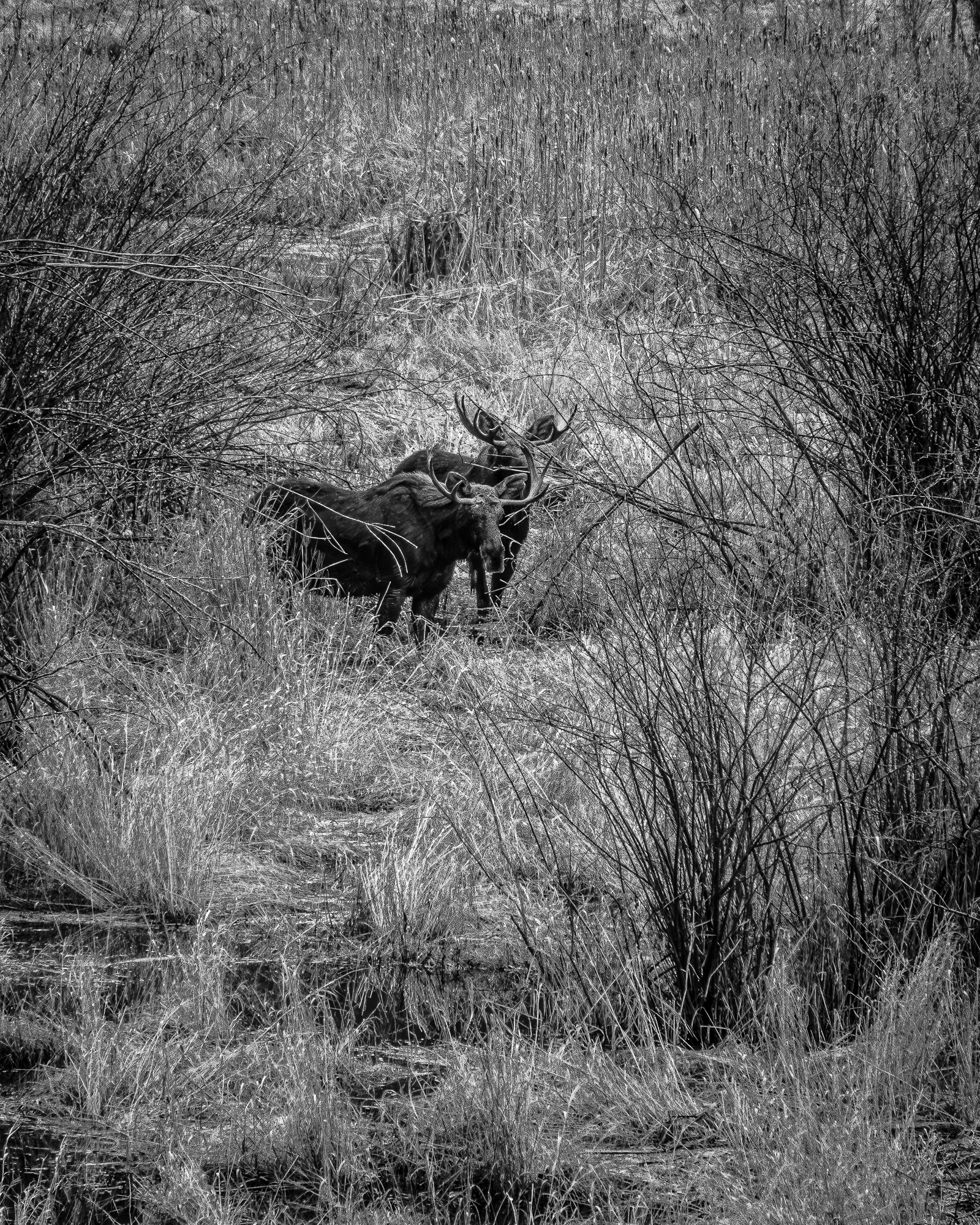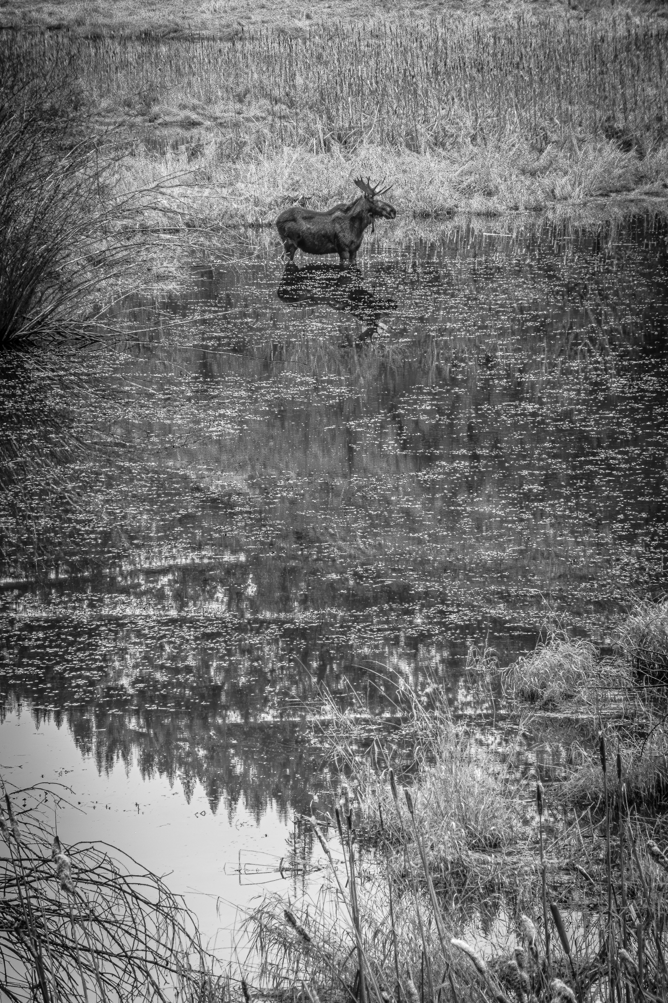 I see moose in my back yard fairly frequently but I have rarely seen them in the water in habitat that looks perfect for them. I could hear the splash of water as they walked across the pond and I could hear the drops from their chin when their large heads emerge from the water.